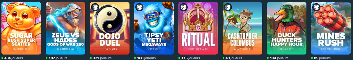 Pour garantir une expérience premium, nous travaillons avec des partenaires reconnus dans l’industrie. Sur notre plateforme, vous retrouverez des noms majeurs comme Pragmatic Play, Evolution Gaming et Hacksaw Gaming — des studios réputés pour leurs mécaniques solides, leurs graphismes modernes et la régularité de leurs sorties.